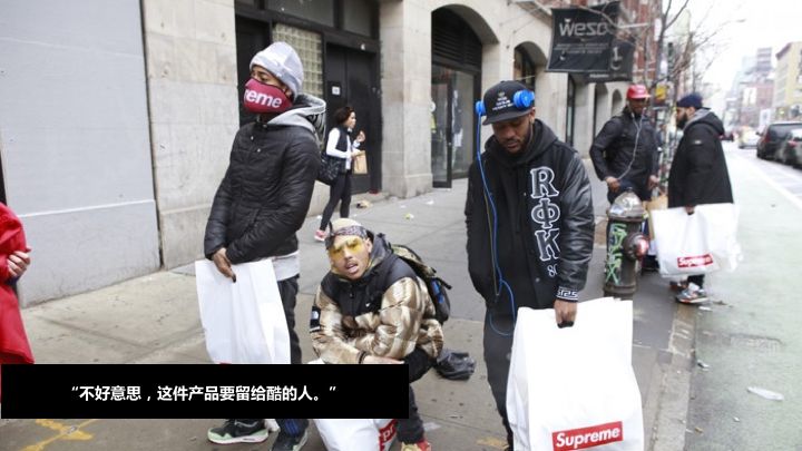 SUPREME从来不做寻找消费者的事情,他们可以产品限量、会让买者完成一场“城市越野赛”才有进店资格,或者直接拒绝长得不够酷的人。SUPREME自己形成了一支队伍,让喜欢的人来排队。