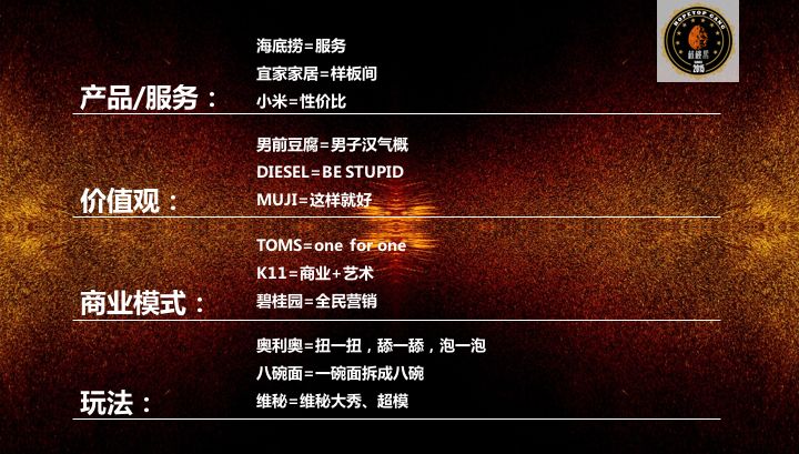 品牌首先要形成消费者认知的独特标签,它是每一个品牌吸引超级用户的前提。这种独特标签的体现可以是产品/服务层面的,也可以是价值观层面的,当然也可以是独特的商业模式,或者是鲜明的玩法。正如下图所示: